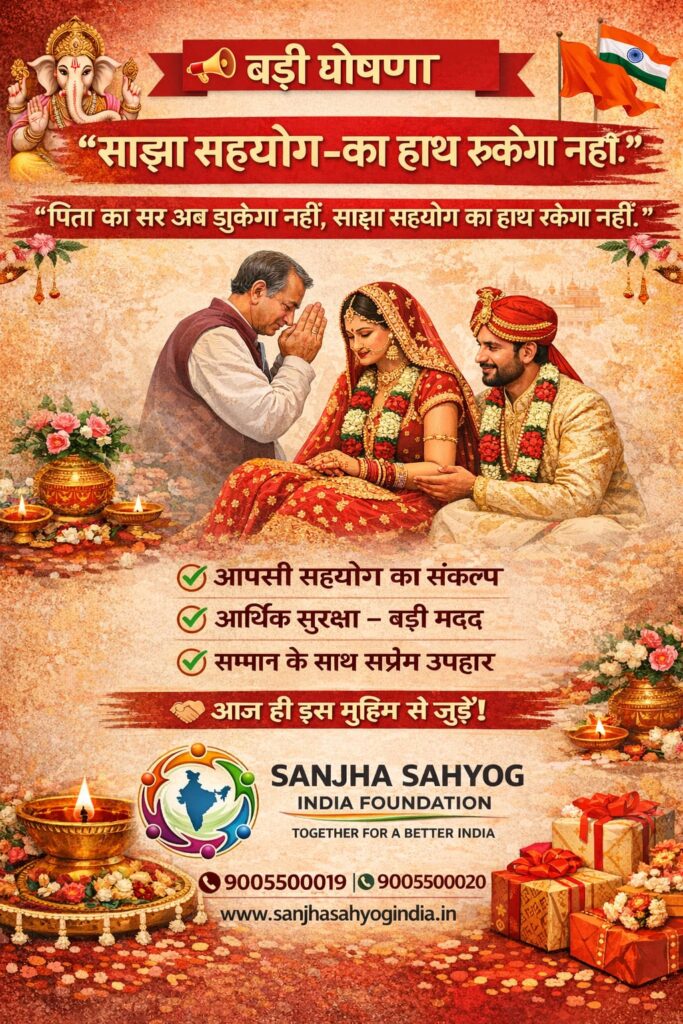 हमें यह बताते हुए गर्व हो रहा है कि साझा सहयोग इंडिया फाउंडेशन ने अपने सदस्यों के लिए एक ऐतिहासिक पहल शुरू की है। हम जानते हैं कि बेटी का विवाह हर पिता के लिए जीवन का सबसे बड़ा सपना और जिम्मेदारी होती है। इसी जिम्मेदारी को साझा करने के लिए हम लाए हैं: कन्यादान योजना।